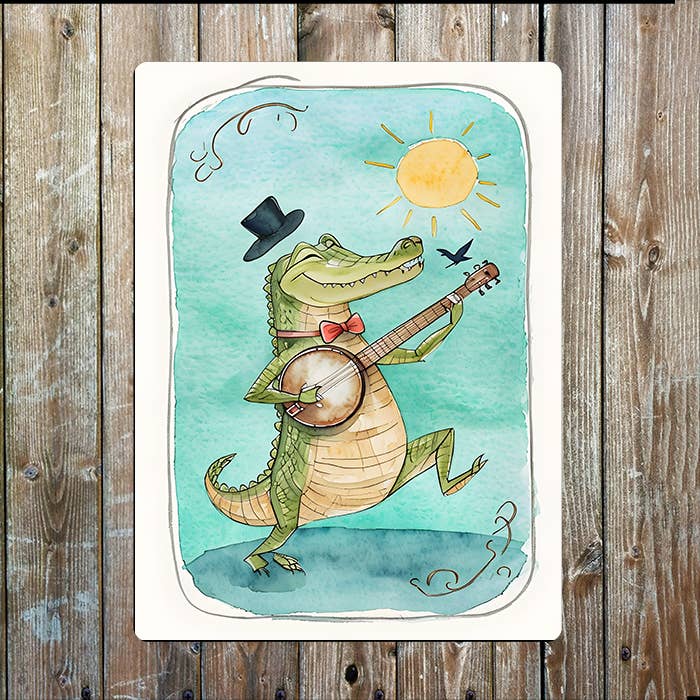Alligator Playing Banjo Under Sun | Metal Sign Plaque