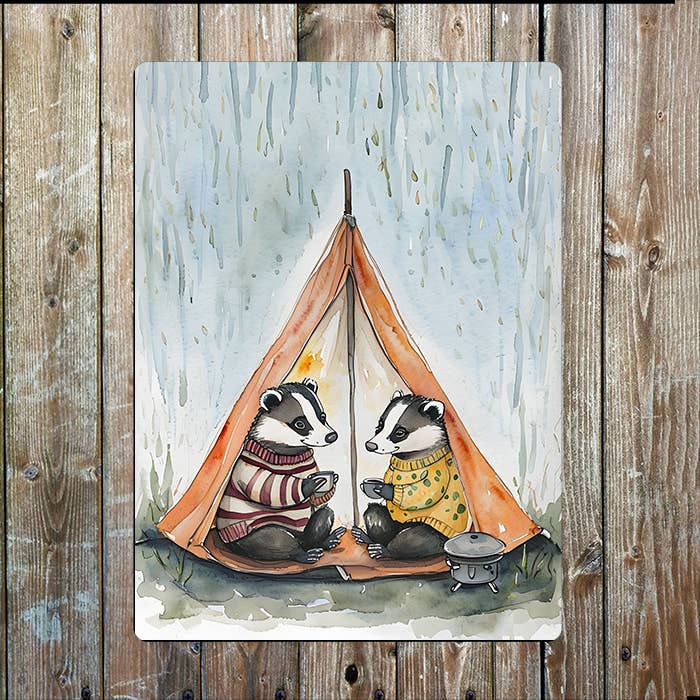 Badgers Enjoying Cosy Tent Camping | Metal Sign Plaque