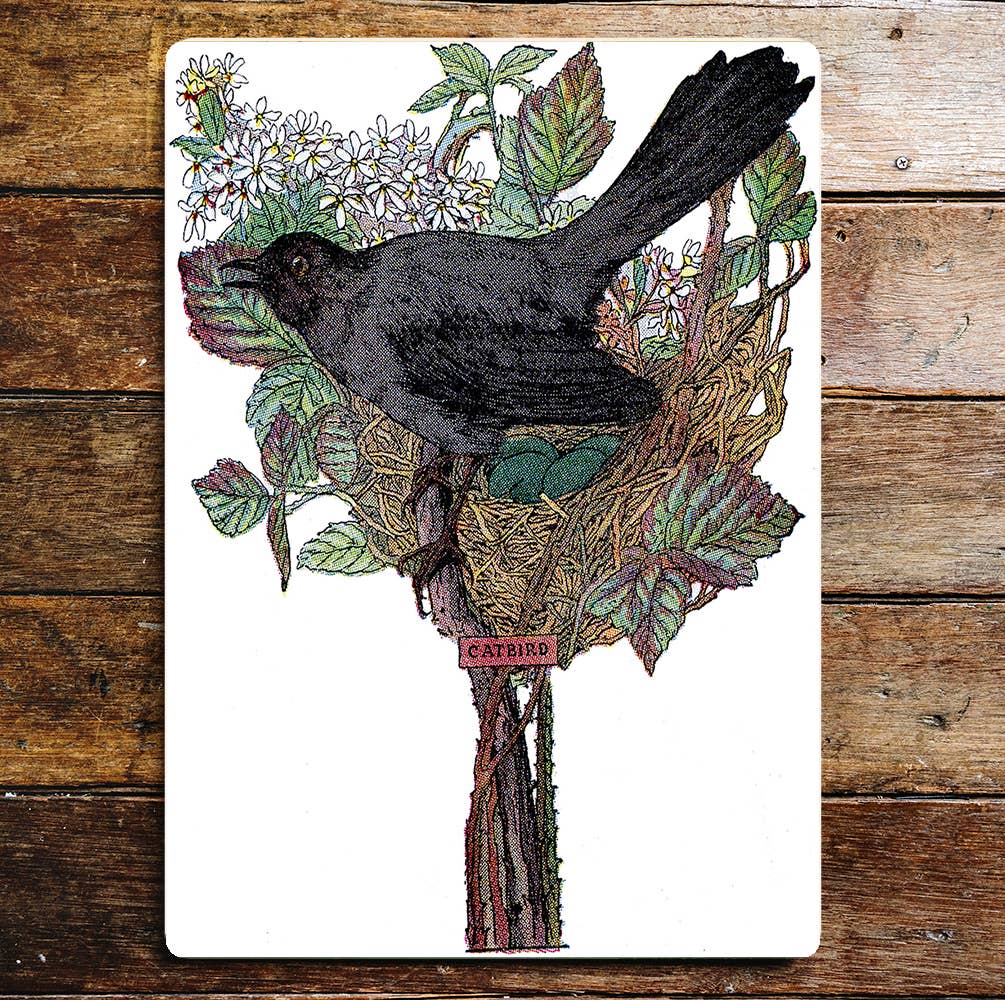 Black Catbird Nesting White Flowers Metal Sign Plaque