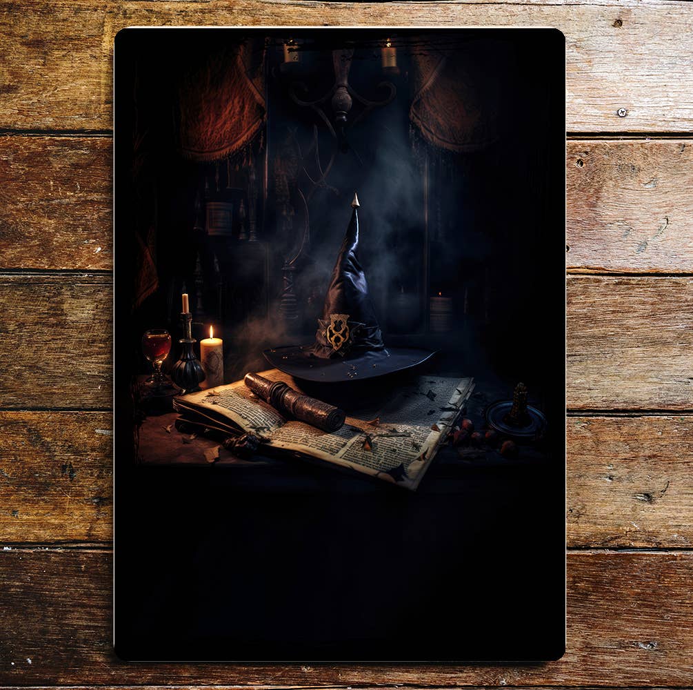 Halloween Wizard Hat Spooky Landscape Metal Sign Plaque