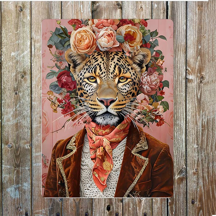 Leopard With Floral Crown in clothes | Metal Sign Plaque