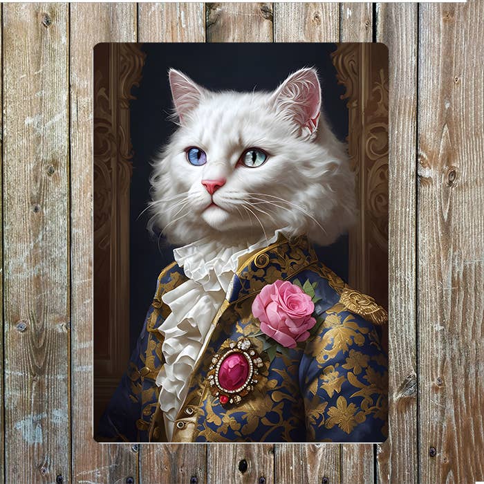 White Cat in 18thCentury Clothes Portrait Metal Sign Plaque